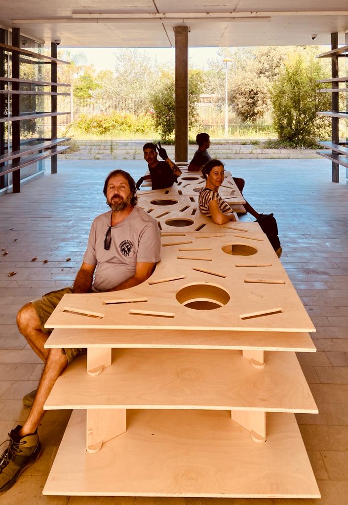 La intervención se compone de 4 módulos que funcionan estratigráficamente como una estantería, un sillón de lectura o un jardín de libros flotando en una suerte de torrente congelado.